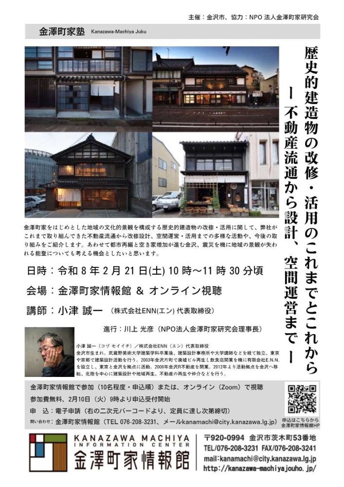 今回は講師として、株式会社ENN(エン)代表取締役の小津誠一氏をお招きし、金澤町家をはじめとする地域の文化的景観を構成する歴史的建造物の改修・活用についてお話しいただきます。不動産流通から改修設計、空間運営に至るまで、これまでの多様な取り組みや今後の活動についてご紹介いただく予定です。