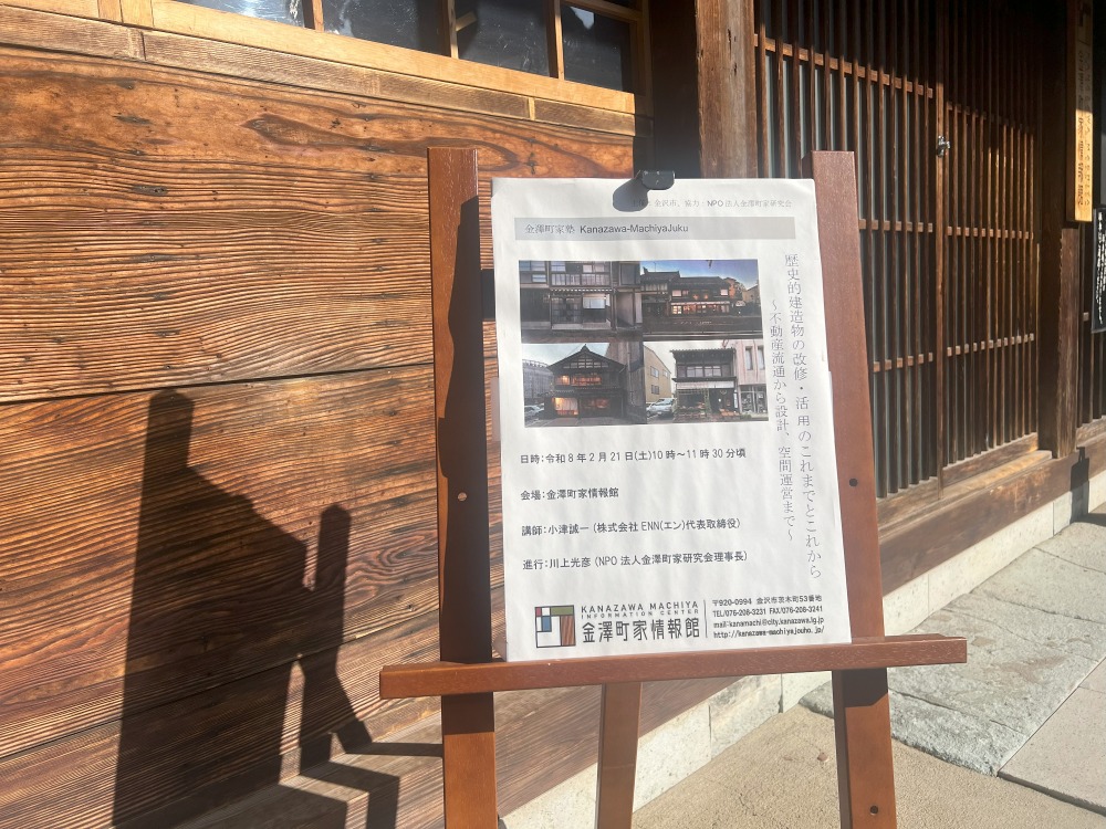 今回は、株式会社ENN代表取締役の小津誠一氏を講師にお迎えし、金澤町家をはじめとした歴史的建造物の改修・活用事例や今後の活動についてお話いただきました。