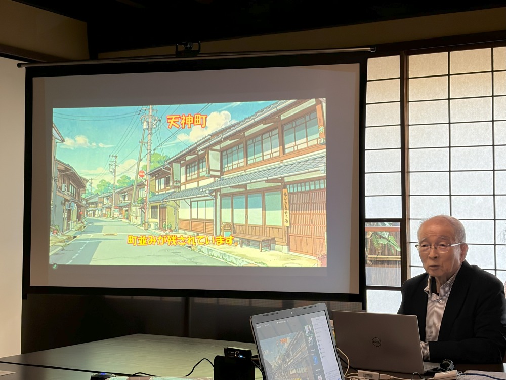 講座では、城下町時代の当時の暮らしを、旧川南町(片町)、旧河原町、大工町等々をAIでアニメ調の町並みにして解説いただきました。商人や職人が暮らす町家は、蔀戸を開け放して商いをしていて、にぎわっていた当時の様子が絵画を見ながら視聴でき講師の話に吸い込まれていきました。